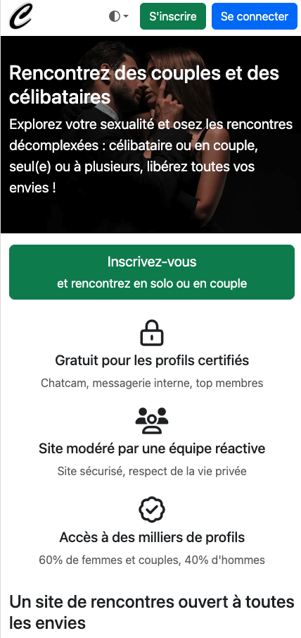 Principalement des couples et des femmes entre 30 et 55 ans, ainsi que des hommes célibataires sérieux dans leur démarche. L’ambiance est globalement courtoise et respectueuse. Il y a moins de profils « fantômes » que sur certains sites, mais aussi moins de monde au total.